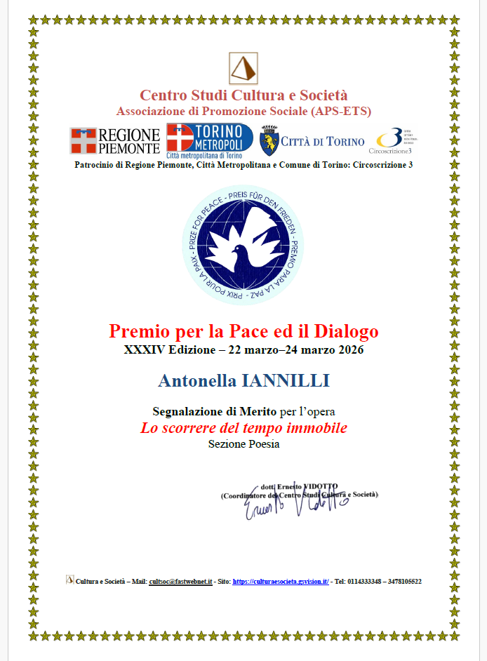 MENZIONE DELLA GIURIA PER LA POESIA -L’AMORE E LA SPERANZA- AL PREMIO LETTERATURA D’AMORE XXXIII EDIZIONE CENTRO STUDI CULTURA E SOCIETA EDIZ.2026 (Regione Piemonte citta di Torino)